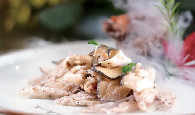 3.将盐、味精、白糖、葱油纳盆,加入黑松露碎调匀,加入熟螺肉片和熟雷笋片拌匀,装盘稍点缀即可。