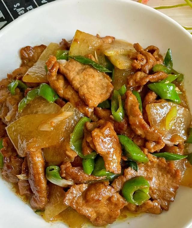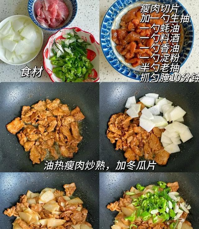 油热放肉片炒熟,加冬瓜片,冬瓜炒至变软,加青椒大葱翻炒均匀即可~