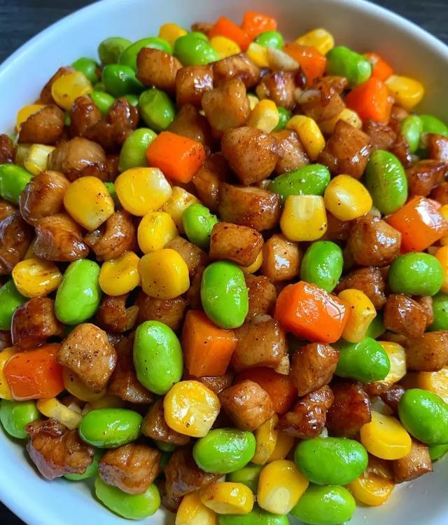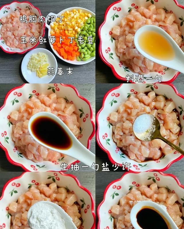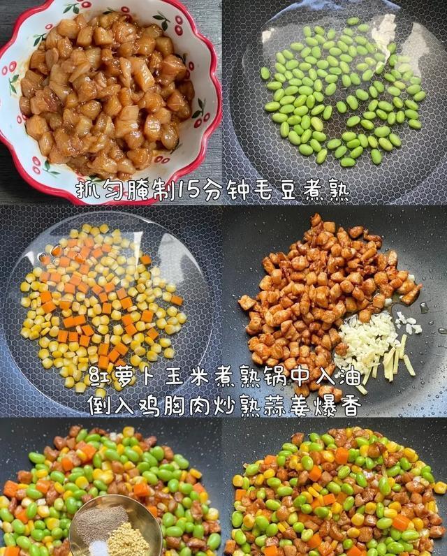 图片来源于网络 侵删毛豆胡萝卜和玉米焯水捞出,油热倒鸡肉炒熟,放蒜末姜炒香,加配菜,放盐胡椒粉和鸡精翻炒均匀即可~