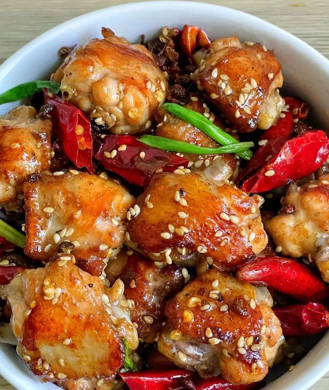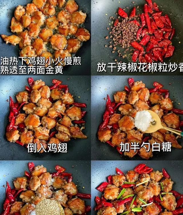 图片来源于网络 侵删油热放鸡翅小火慢煎盛出,放干辣椒花椒炒香,倒入鸡翅,加半勺糖,一勺芝麻,撒上葱段翻炒均匀即可~