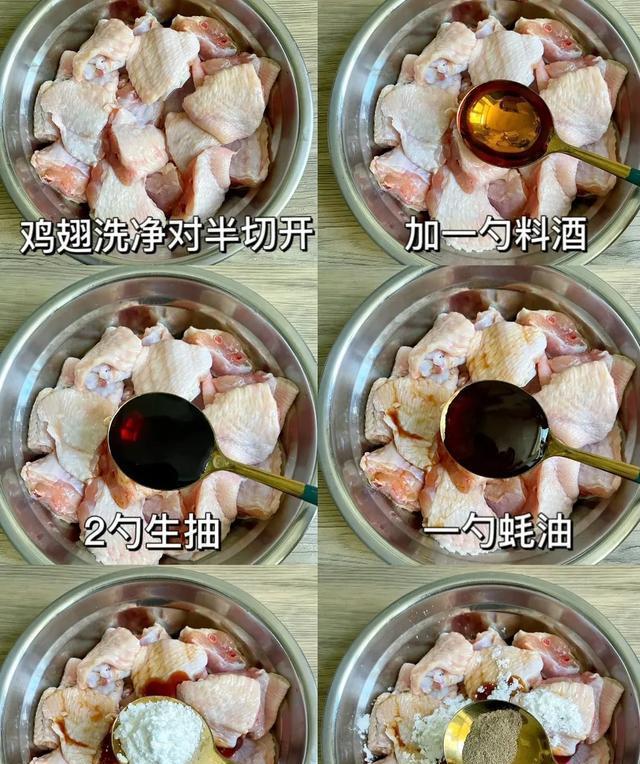 图片来源于网络 侵删做法:鸡翅对半切开,加一勺料酒,两勺生抽,一勺蚝油,一勺淀粉,半勺胡椒粉抓匀腌制~