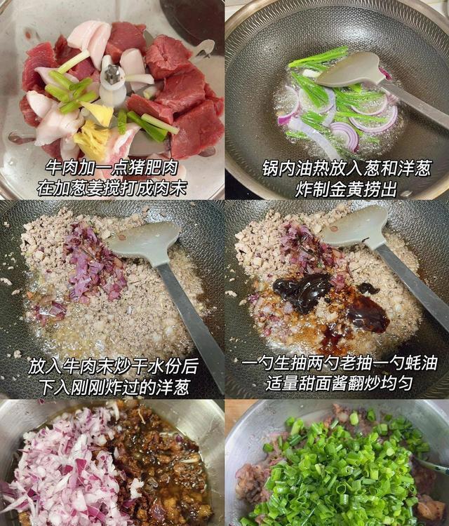 图片来源于网络 侵删食材牛肉馅:牛肉 少量猪肥肉 小葱 洋葱面团:300g面粉 200g 清水 3g酵母步骤:1、牛肉加少量猪肥肉放入绞肉机搅打成颗粒状肉末,牛肉和猪肥肉比例8:22、锅内热油下入洋葱和小葱炸制金黄捞出、然后下入牛肉未炒干水份,把刚刚炸过的洋葱切碎放入锅中,加一勺生抽两勺老抽一勺蚝油适量甜面酱翻炒均匀3 、超好的肉馅放适量洋葱末拌匀放入冰箱冷藏3、4个小时,冷藏好的牛肉馅加适量葱花拌匀