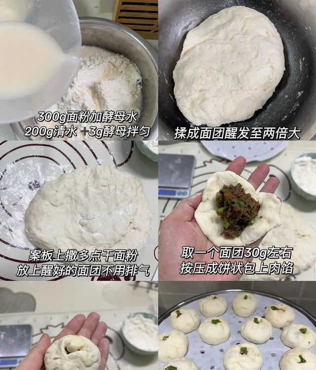 图片来源于网络 侵删4 、馅弄好之后准备面团部分,300g面粉加3g酵母200g清水揉成偏软面团醒发至两倍大5 、案板上多撒点干面粉,把醒好的面团放在案板上,不用揉戳排气,取一个小剂子差不多30g左右,压成饼状包上肉馅,捏紧收口6 、包好的包子放入蒸锅二次醒面15分钟,开火蒸15分钟焖3分钟
