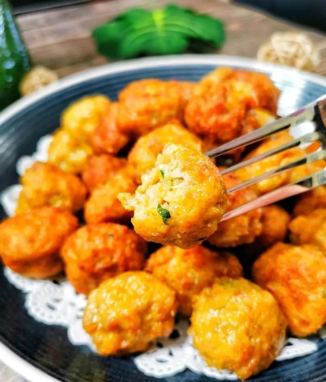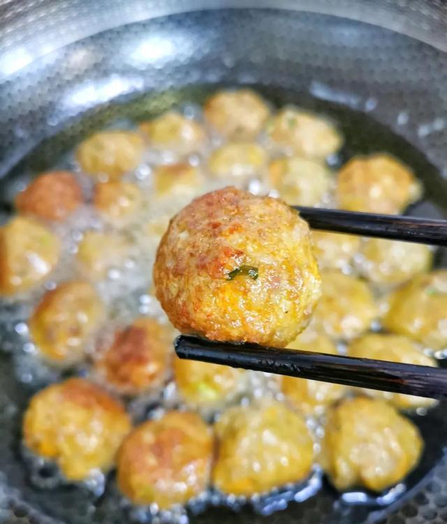 图片来源于网络 侵删5、锅中加入食用油烧热,将做好的馅料用勺子取出合适的大小,或者是用手也可以,搓成是小丸子,然后放入油锅中开始炸制。