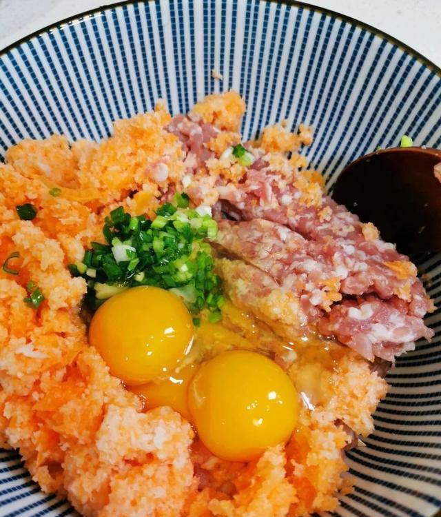 图片来源于网络 侵删2、搅拌好的胡萝卜泥取出来放入碗中,然后加入两个鸡蛋,肉末还有适量的葱花,肉末大姐也可以用绞肉机搅拌,没有绞肉机的情况下可以买来现成的或者是自己剁也可以。