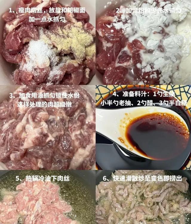 1.瘦肉切丝(我喜欢用梅花肉,250克),放盐和胡椒面加一点水抓匀,再放入玉米淀粉和少许水抓匀,最后加一点食用油抓匀,这样可以锁住水份,炒出来的瘦肉超级嫩。