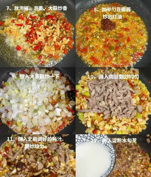 5.倒入肉丝翻炒匀均,加入料汁翻炒一下,最后加入淀粉水炒匀即可出锅。(这一步大家可以尝一下,觉得糖和醋不和口味的可以根据自己口味添加)