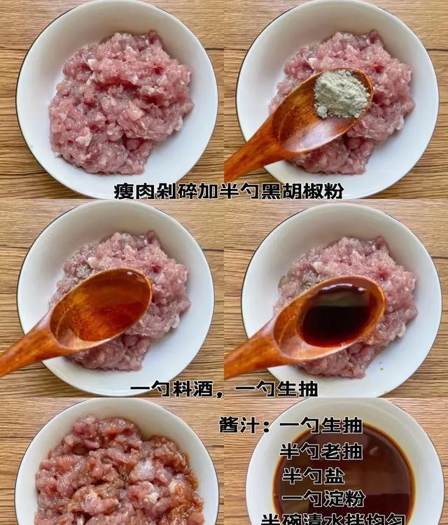 1.瘦肉剁碎加半勺黑胡椒粉,一勺料酒,一勺生抽,拌均匀腌制10分钟