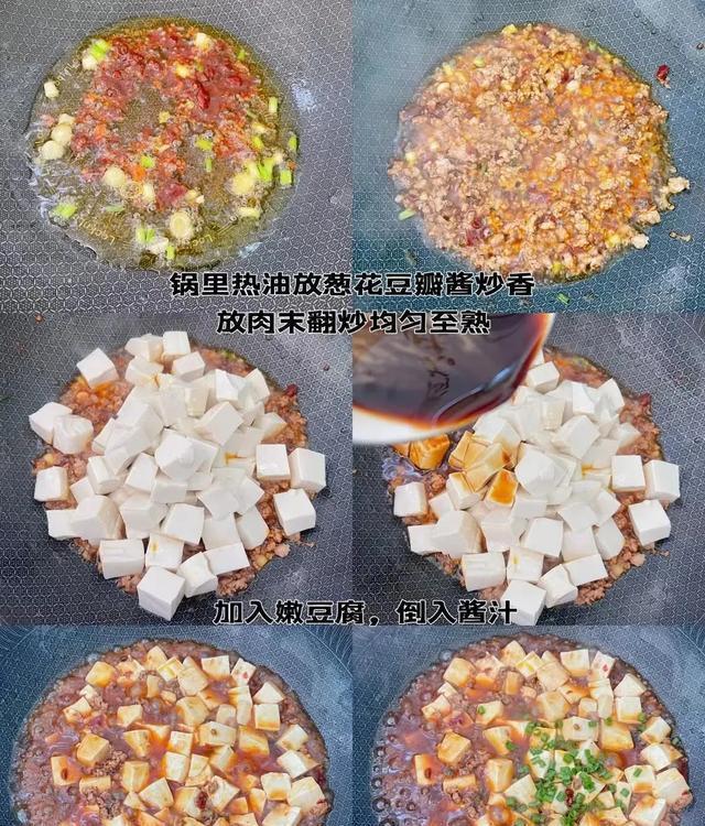 3.锅里热油放葱花豆瓣酱炒香,放肉末翻炒均匀至熟