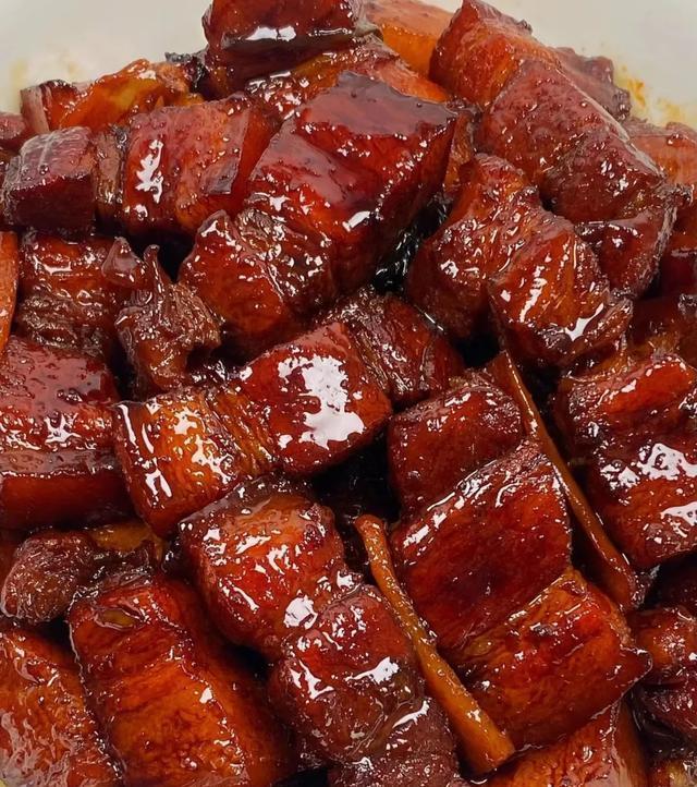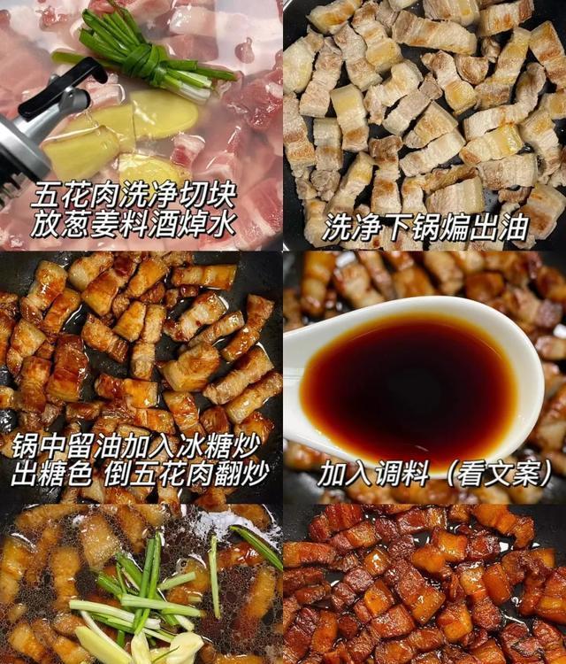 1.五花肉洗净切块,放入锅中加葱姜、料酒焯水2.焯水后洗净,下锅煸出油,锅中留油加入冰糖炒出糖色,倒入五花肉翻炒上色3.加3勺生抽?1勺料酒?1勺蚝油?半勺老抽和葱姜蒜、八角,开水没过食材,大火煮开,小火炖50分钟收汁即可出锅