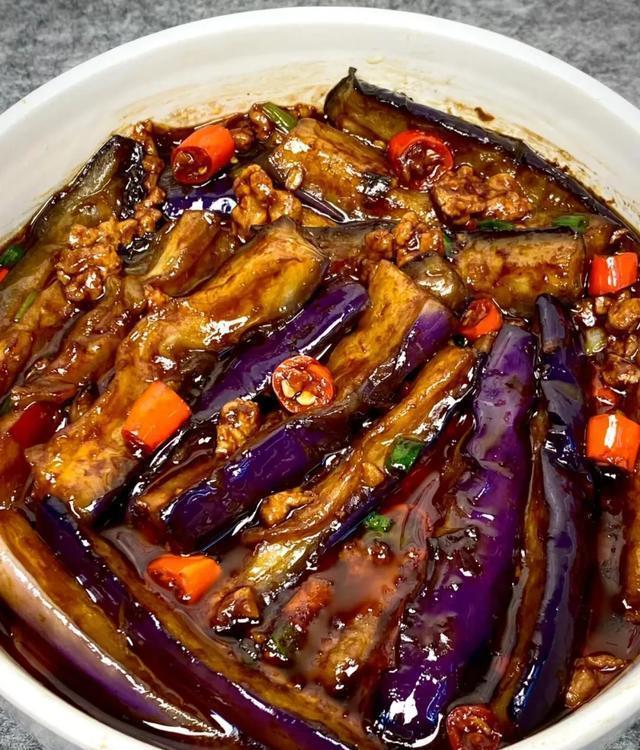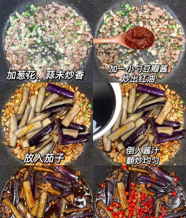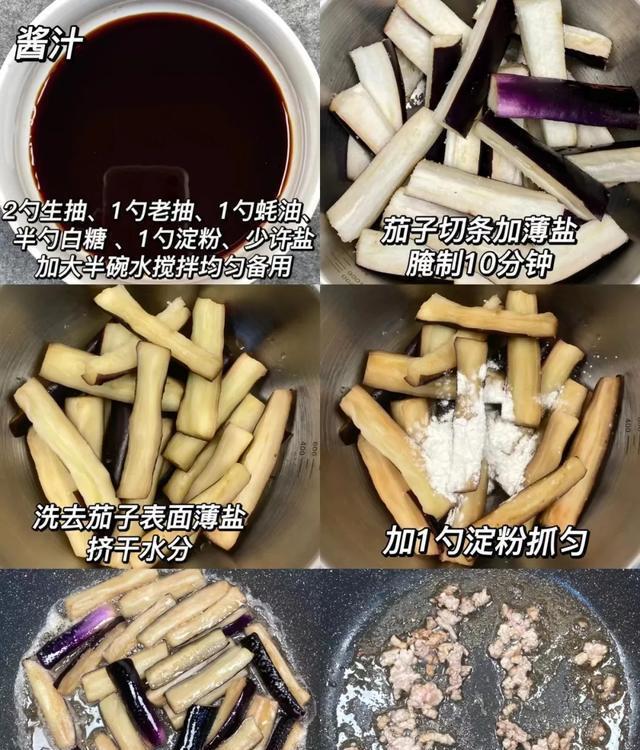 图片来源于网络 侵删【食材】茄子、肉沫、葱花、蒜末、小米辣【步骤】1.酱汁:2勺生抽、1勺老抽、1勺蚝油、半勺白糖 、1勺淀粉、少许盐,加大半碗水搅拌均匀备用2.茄子切条加薄盐腌制10分钟,洗去茄子表面薄盐,挤干水分, 加1勺淀粉抓匀 3.油热下茄子炒至两面微黄盛出,再下肉末炒至变色,加葱花、蒜末炒香加一小勺豆瓣酱炒出红油4.放入茄子翻炒均匀,倒入酱汁,汤汁中小火,下小米辣翻炒30秒,收到浓稠,出锅撒上葱花即可出锅