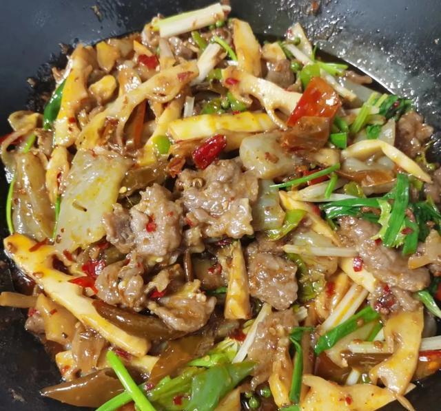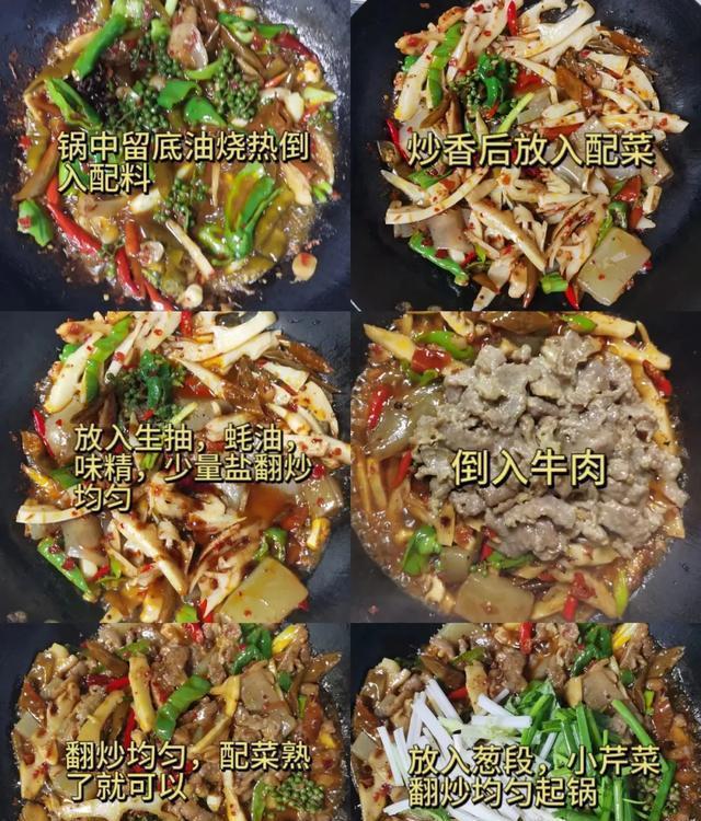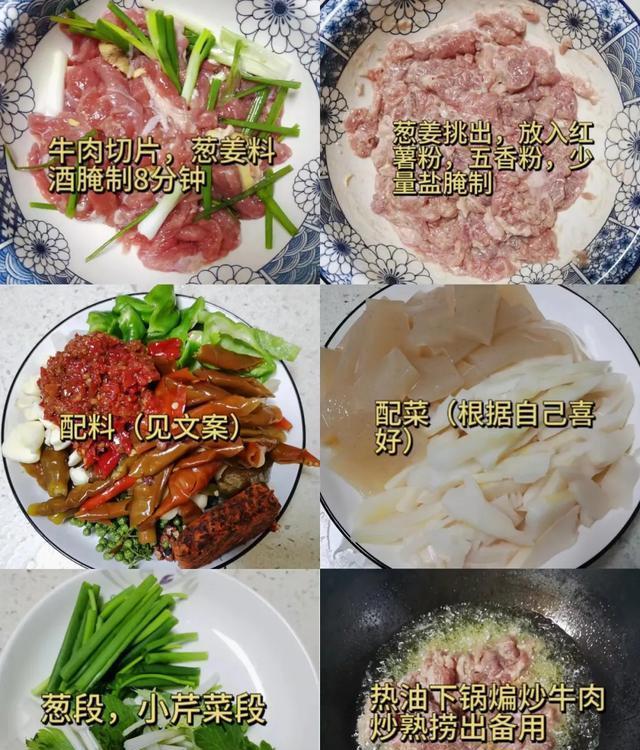 1.牛肉切片用葱姜料酒腌制八分钟之后挑出,放入红薯粉,五香粉,少量盐腌制。(等待的时间可以准备配料)2.将腌制好的牛肉下热锅煸炒熟,盛出备用。3.锅中留底油烧热,倒入配料,炒出红油和香味后,放入配菜,放入生抽,蚝油,味精和少量盐翻炒均匀,炒到竹笋差不多熟了就可以放入牛肉,搅和搅和就可以放入葱段和小芹菜,再搅和搅和就可以起锅。