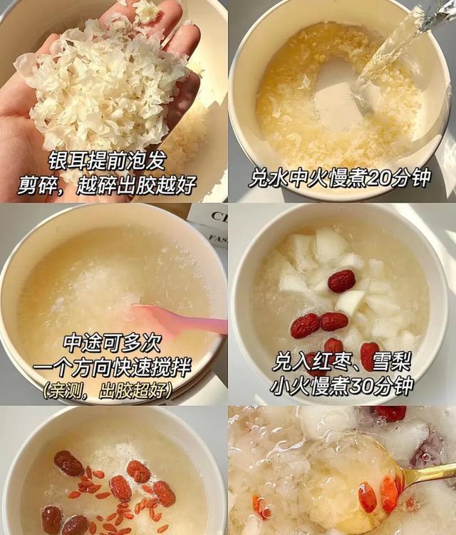 图片来源于网络 侵删【食材】雪梨、枸杞、银耳、冰糖、红枣【步骤】1.银耳提前泡发,剪碎,越碎出胶越好2.银耳兑水煮20分钟,中途可多次一个方向快速搅拌(出胶好的关键)3.加入雪梨、红枣、冰糖,再小火煮20分钟4.关火撒入枸杞出锅