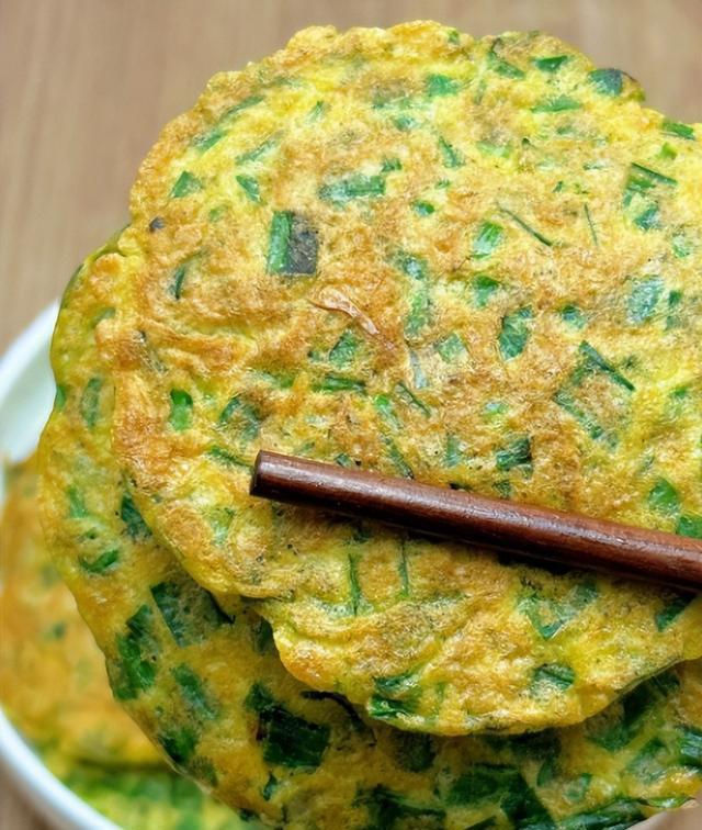 7. 煎饼:锅中重新加热少许油,倒入混合好的蛋液和韭菜,保持中小火,慢慢煎至两面金黄。可以用铲子轻轻压一压,确保煎得均匀,避免中间未熟。约煎3-4分钟后翻面,再煎2-3分钟,直到两面呈金黄色并且熟透。