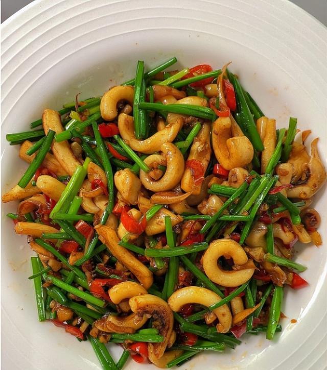 7. 加入韭菜炒匀:当鱿鱼花炒至八分熟时,加入韭菜段,继续翻炒。韭菜炒至稍微变软即可,不要炒得过老。加入1小勺蚝油、1大勺生抽和适量盐调味,快速翻匀,使韭菜和鱿鱼花入味。