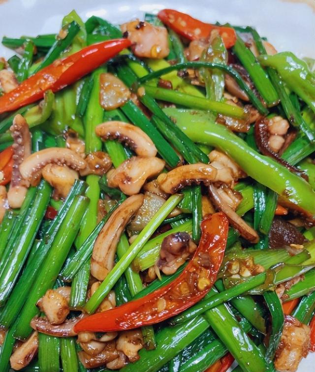 5. 加入韭菜:将切好的韭菜段加入锅中,快速翻炒。韭菜本身含水分较多,翻炒时要注意不要炒得过软,以保持韭菜的脆嫩口感。