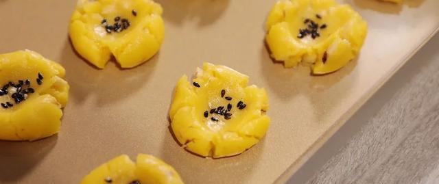 图片来源于网络 侵删用大拇指将小球按扁。然后撒一点黑芝麻在中心(生熟芝麻均可),再用手指略微压一压使芝麻压入面团里。