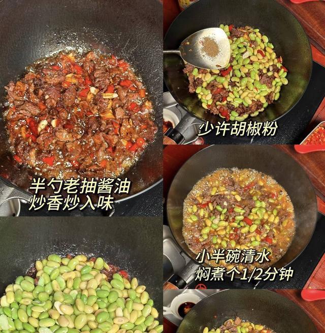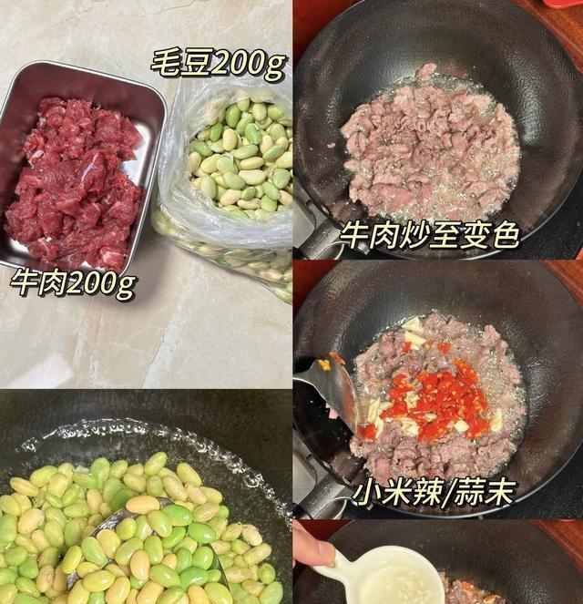 图片来源于网络 侵删接着,加入蒜末和姜丝,爆炒出香味后,迅速放入毛豆,继续翻炒至毛豆表皮略微皱起,保持毛豆的清脆口感。在此基础上,加入红椒丝,丰富颜色与风味,最终再将牛肉放回锅中,加入盐进行最后的调味。所有材料稍加翻炒,通常约需要3-4分钟的时间,确保每一口都能品尝到浓烈的香气。