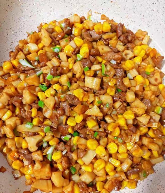 3. 倒入藕丁和玉米粒,转中火翻炒3分钟,至藕丁熟透、玉米粒变软;