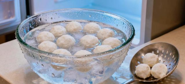 - 煮好的鱼丸捞出后,立即放入提前准备好的冰水中浸泡5分钟。