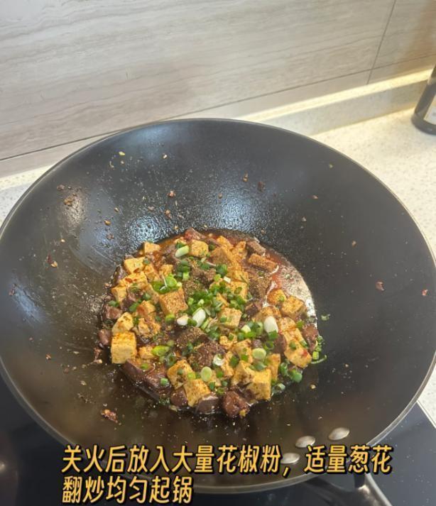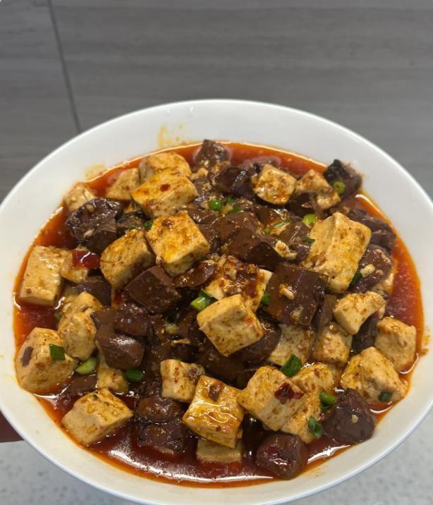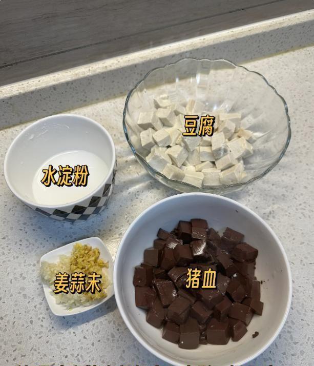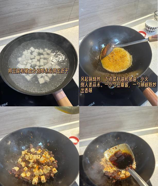 材料:一块豆腐,一块猪血,水淀粉,姜蒜末,一小勺豆瓣酱,一勺辣椒,盐,生抽,老抽,味精,花椒粉,葱花。