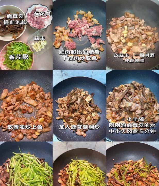 材料:适量鹿茸菇,适量五花肉,大蒜末,适量香芹段,酱油,蚝油,盐。