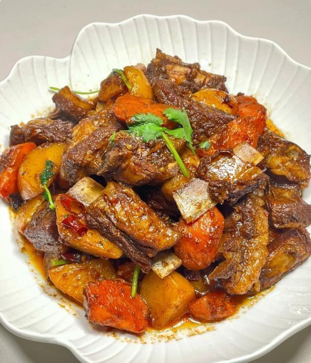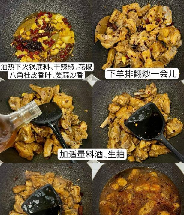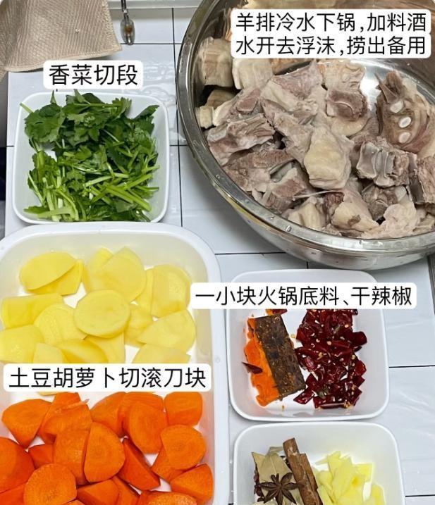 图片来源于网络 侵删材料:适量羊排,香菜,土豆,胡萝卜,一块火锅底料,干辣椒,花椒,八角,香叶,姜蒜。生抽,老抽,料酒,