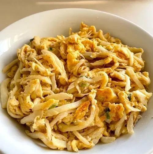 3、起锅烧油,油热后倒入鸡蛋液煎一下,煎至定型后,炒散盛出备用。