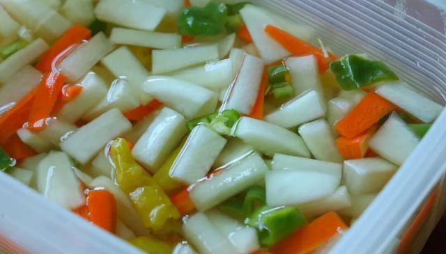 图片来源于网络 侵删2、把表面的盐分清洗干净,再把萝卜装在一个干净消毒的保鲜盒里,胡萝卜也加进去,再加一点青椒块;