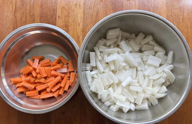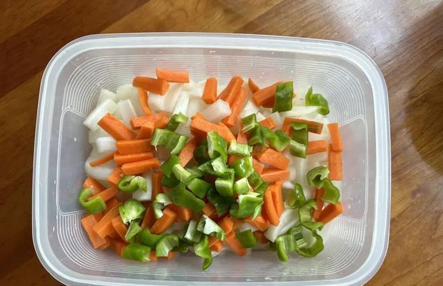 萝卜这东西真是实在,三根大萝卜加一根胡萝卜,腌好能装满整个保鲜盒,够吃上好几天。最妙的是食材的搭配——白萝卜是主角,出水后变得惊人的脆爽;胡萝卜添一抹甜丝丝的橙黄;青椒则悄悄贡献一丝若有若无的辣意。这红白绿的组合,光看着就让人胃口大开。