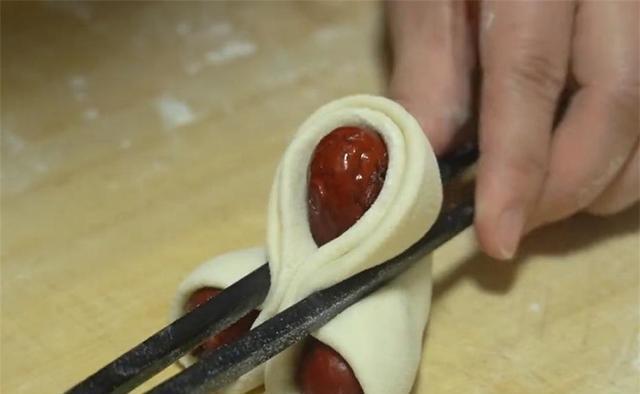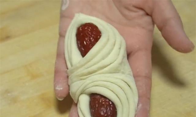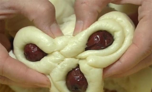 图片来源于网络 侵删6.把它们叠放成一摞,两侧分别放上红枣,最后把肩部往上拉,捏起来固定,中间的部分用刮板压一下,这样第一款双角枣花馍就做好了。