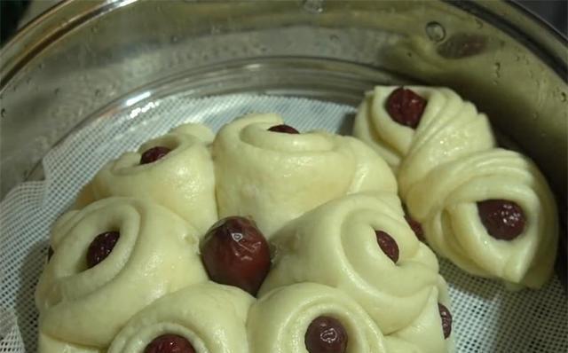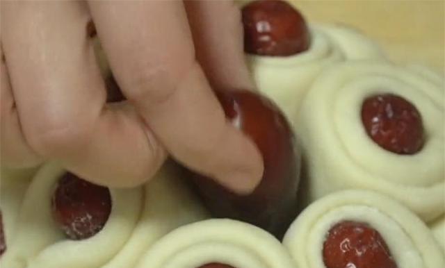 图片来源于网络 侵删7.剩下的另一半面团搓成长条,也分成大小均匀的剂子,把面剂子擀成圆饼状,在两边放上两个红枣,先对折一下,中间再放上一个红枣,再对折起来。用筷子夹住中间捏一下,这样一个花瓣就做好了。