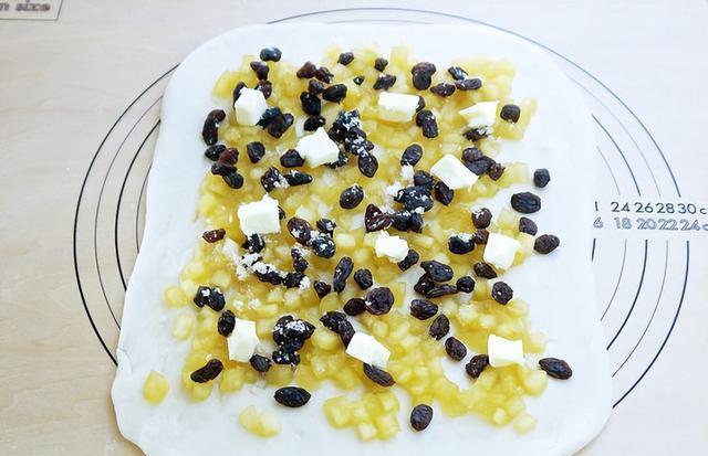 图片来源于网络 侵删5 把面团从容器内取出后,轻压面团排出空气,接着用面棍将面团成约28 x 22cm 的长方形,翻面后表面铺上苹果酱,均匀撒上葡萄干及三温糖,再等距摆放少许切成小丁的黄油。