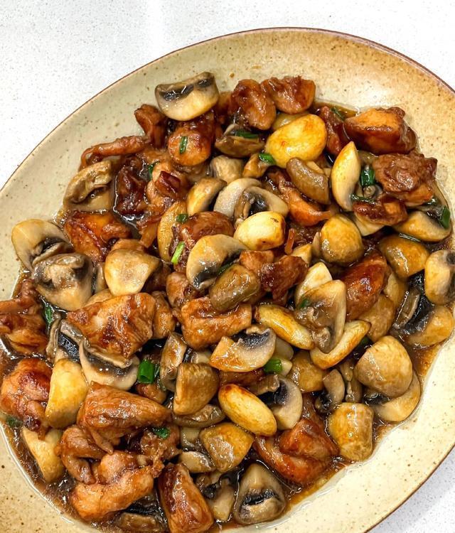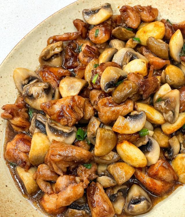 处理食材:鸡胸肉切丁,加生抽、料酒、淀粉抓匀腌制。香菇切片,胡萝卜切丁。滑炒鸡丁:热锅少油,下入鸡丁快速滑炒至变色,盛出备用。炒香菌菇:用锅中底油爆香蒜末,下入胡萝卜丁、香菇片和白玉菇,中火翻炒至菌菇变软出汁。混合:倒入炒好的鸡丁,加入1勺蚝油和适量盐,快速翻炒均匀即可。