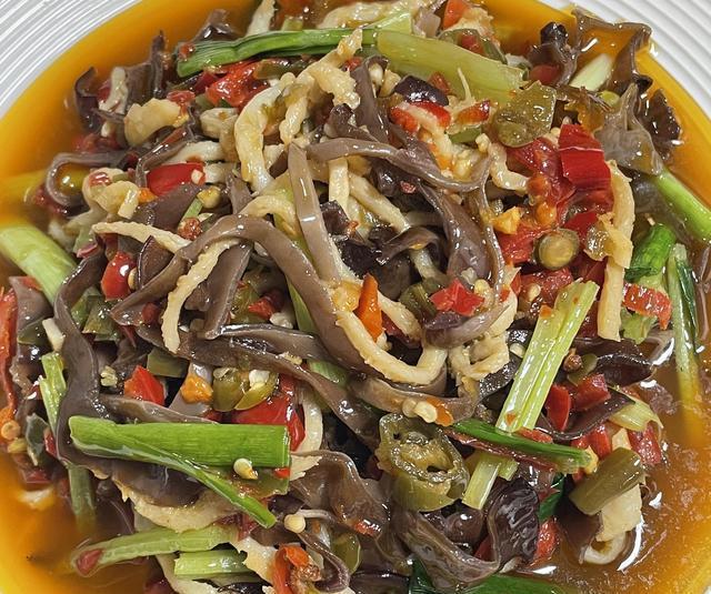 食材:毛肚条、木耳、芹菜、泡椒、小米辣、姜蒜、花椒、葱、盐、味精、木姜籽油、生抽