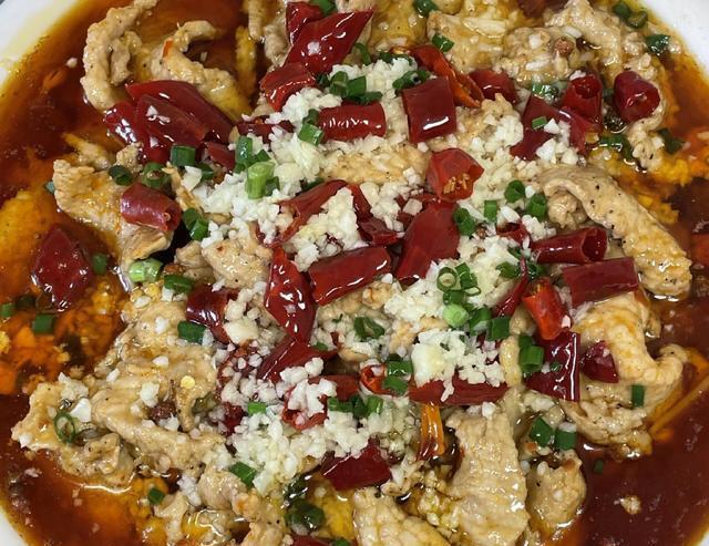 5、在肉片上放入干辣椒、花椒、蒜蓉、葱花等调料,淋上热油激发出香味。一道麻辣鲜香、滑嫩入味的水煮肉片就完成了。