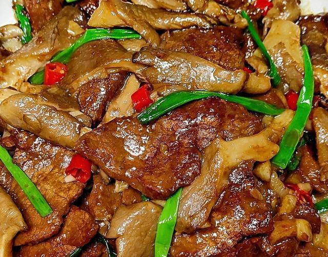 食材:牛里脊、平菇、小葱段、蒜末、小米椒、生抽、老抽、料酒、淀粉、糖、胡椒粉、盐