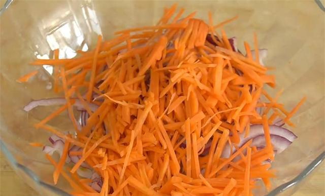 图片来源于网络 侵删2.准备一根胡萝卜切片,再切成丝,洋葱对半切开再切成条,放在大碗里备用。