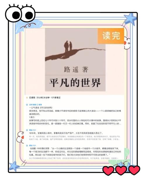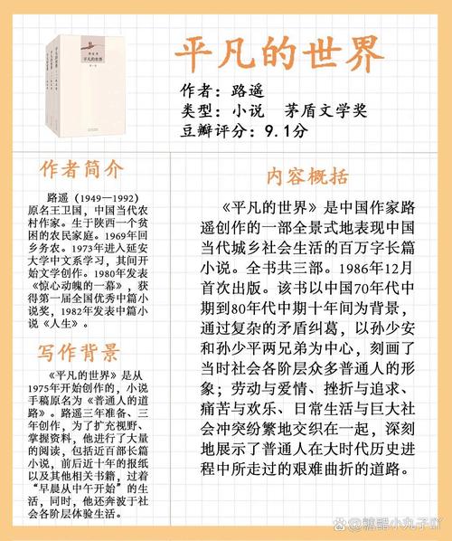 它不仅是一部小说,更是一部关于人生、奋斗和情感的教科书。总结《平凡的世界》是一部值得反复品读的经典之作。它以宏大的时代背景、深刻的人生哲理、鲜活的人物形象和真挚的情感描写,打动了无数读者的心灵。无论你是喜欢文学、历史,还是寻求人生启示,这本书都能给你带来深刻的思考和感动。