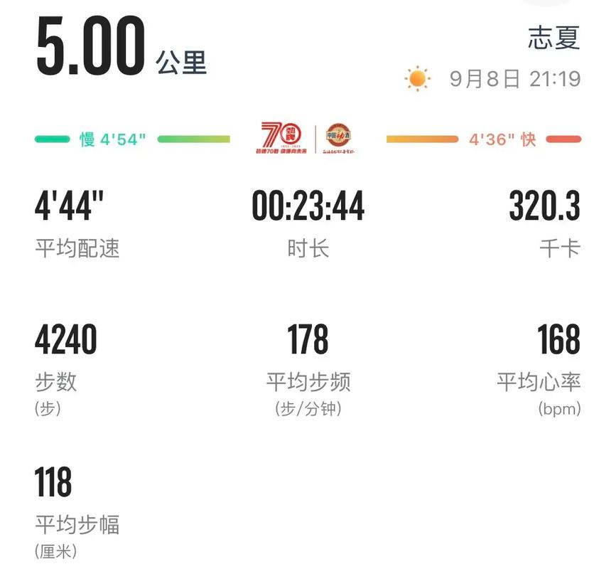 配速每公里跑进五分钟之内了。四分五十九秒的配速是破五,这个配速不管是跑多远的距离,算是比大众水平稍微高点的水平,大多的跑步爱好者,他们平时跑步配速一般都在五六分钟之间,能够破五的属于比较厉害的,能够占到跑步爱好者的十分之三左右,总之,只要能够破五就算是水平比较高的了。