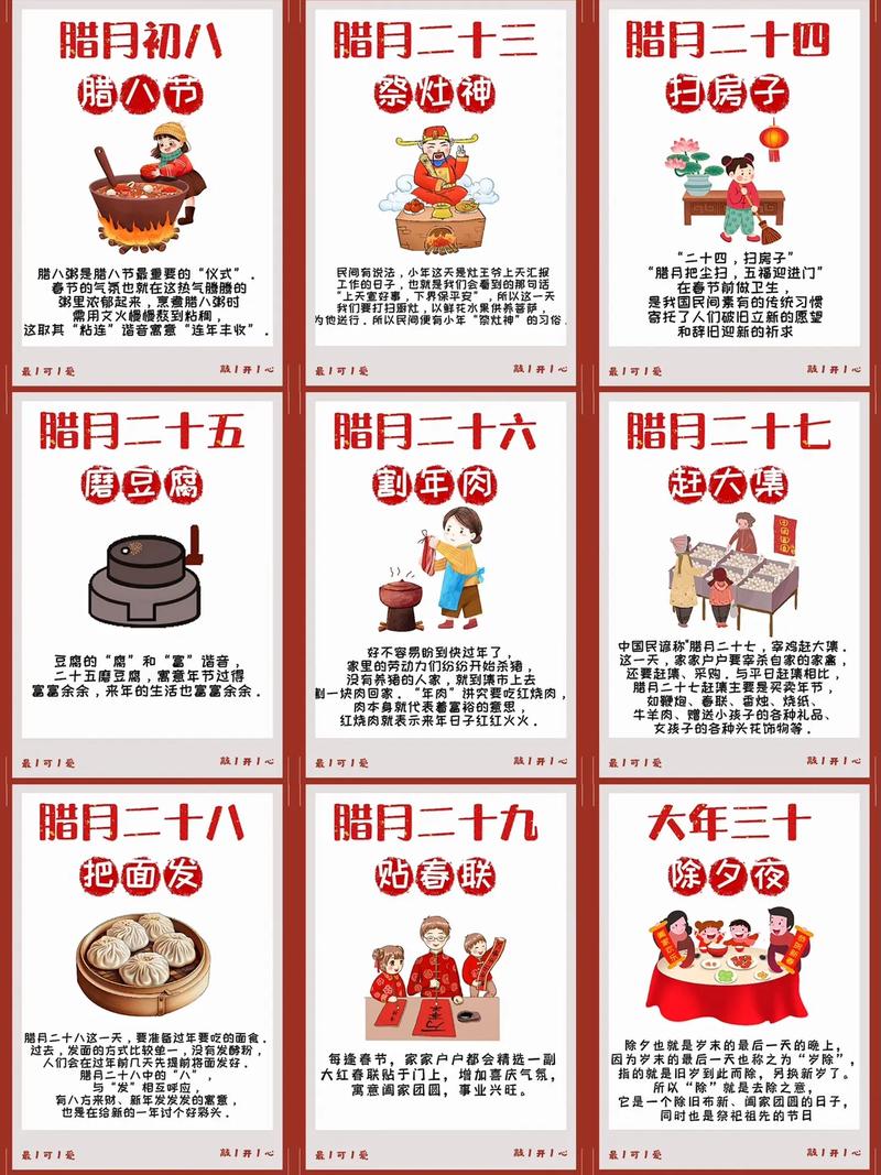 2、腊八节是祭祀祖先和神灵的重要日子。在这一天,人们会在家中或寺庙里设立祭坛,摆放供品,如腊八粥、水果、鲜花等,以祈求祖先和神灵的保佑和庇护。同时,人们也会通过祭祀活动来表达对祖先的敬仰和怀念之情。扫除除尘 腊月里扫尘的风俗历史悠久,早在尧舜时代就已存在。
