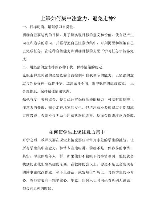 3、有些同学只顾思考,忘了听讲。合理分配注意力,听、想、记并重,理解内容为重点,兼顾各方面,能大大提高课堂学习效果。同时,这也有助于培养良好的注意转移和分配能力。总之,让孩子上课认真听讲需要家长和老师共同努力。通过上述方法,孩子可以更好地集中注意力,提高学习效率,最终实现学业进步。