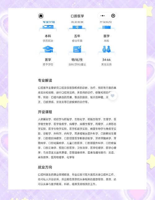 2、大专学口腔医学专业是一个值得考虑的选择。以下是几个关键点:职业发展路径灵活:深造机会:大专毕业后,可以通过专升本考试获取口腔医学专业的本科毕业证书及学位证书,为未来成为执业口腔医生打下基础。直接就业:也可以选择直接在大专毕业后考取口腔助理医师资格证,通过积累经验后再考取医师证。