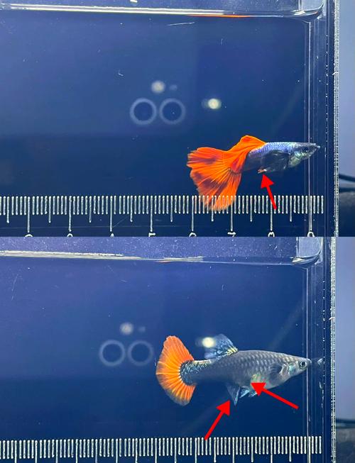雄鱼体积一般均较雌鱼小。观察体色:公鱼通常先发色,雄性所表现出来的体色较雌性鲜艳夺目许多。观察肚子后部:小母鱼可见肚子里面的颜色。小公鱼则是白肚皮包着,基本看不到里面颜色。通过以上方法,可以较为准确地分辨出孔雀鱼幼崽的性别。