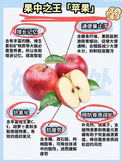 4、含有多种维生素:苹果富含维生素A、C、E等,这些维生素对于维持人体正常的生理功能至关重要。富含类黄酮和抗氧化剂:苹果中含有大量的类黄酮和抗氧化剂,这些成分有助于清除体内的自由基,减少氧化应激,从而保护细胞免受损伤。