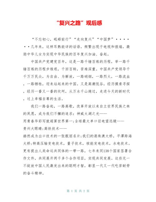 《复兴之路》观后感 历史回顾与民族觉醒 《复兴之路》深刻展现了中国从民族觉醒到选择社会主义道路的历程。这段历史充满了艰辛与挑战,但中国人民始终保持着不屈不挠的精神,不断寻求民族独立和解放的道路。