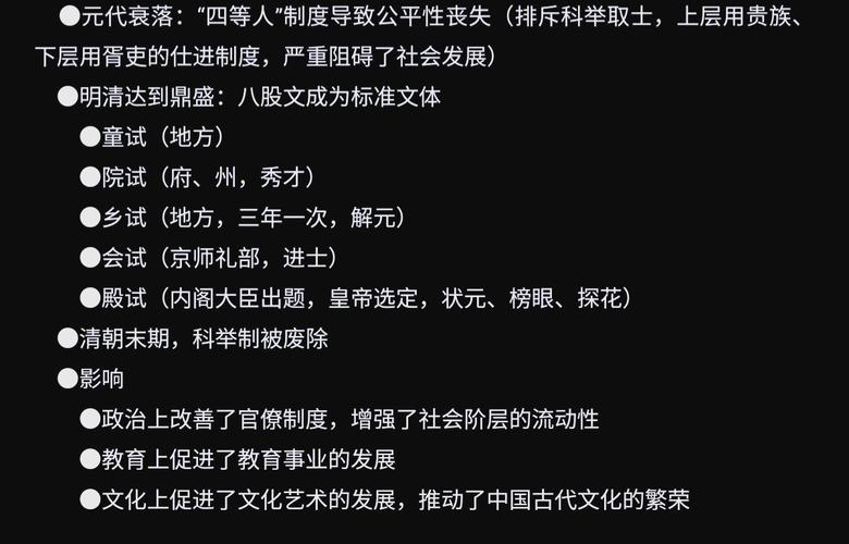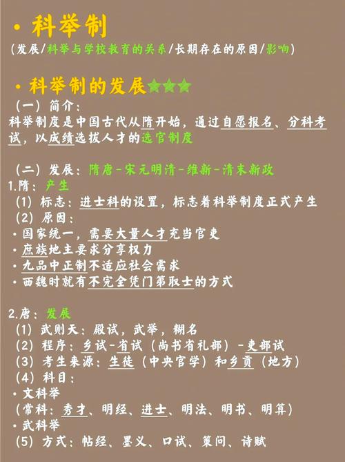 3、中国古代科举制度的兴衰历程如下:创立阶段:科举制度始于隋朝。隋文帝时期开始采用分科考试的方法来选拔官员,隋炀帝时期正式设置了进士科,这标志着科举制度的诞生。其创立背景是为了解决传统选官制度注重门第、不利于人才选拔的弊端。发展阶段:唐朝在隋朝的基础上对科举制度进行了完善和发展。