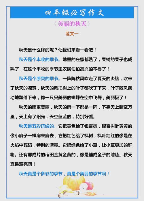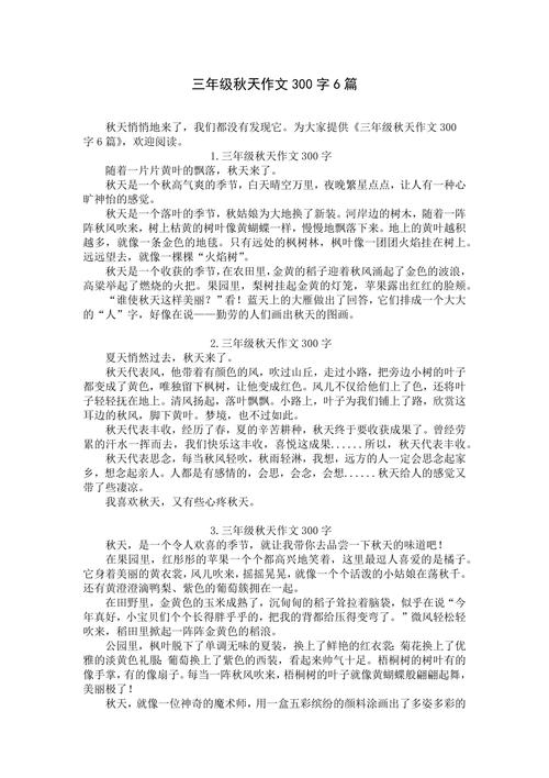 【二】:秋天 秋天来了,天天气渐渐变凉了。蔚蓝的天空中,有几朵白云飘来飘去。大雁们排成一字形往南方飞去,菊花迎着秋风慢慢开放了。秋风吹起来了,枯黄的叶子从大树妈妈的怀中落下来,落到了地上,地上就象铺了一层金黄色的垫子。