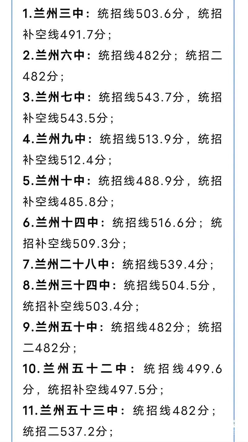 师大附中统招线669分,补录线667分。兰州一中统招线655分,补录线648分。兰州三十三中统招线640.5分,补录线627分,东城校区600.8分。兰炼一中统招线643分,补录线630.8分,国际班619分。兰炼二中统招线603分,补录线598分。