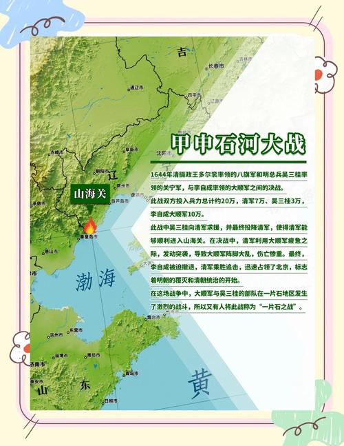 3、清朝进入山海关的过程如下:历史背景与密约 西元1644年(清顺治元年),清朝与明朝之间已经存在某种程度的秘密协定。在太宗时期,明朝皇帝曾派遣密使兵部尚书前往满洲(即大清国)进行谈判,双方商议共同镇压明朝内部的农民起义。这一密约为清朝后续的行动提供了政治基础。